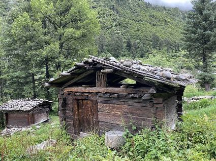 隨著海拔高度的升高與緯度的增加,一路上的植被類型也在不斷發(fā)生著變化。穿越深闊的暗針葉林,六匹馬起起落落的腳力踩出了一個馬幫的回音,所有的植物在各自的生命活動中散發(fā)出了清新怡人的芬多精,吉美為此小聲哼唱起了愉悅的歌兒,細(xì)聽卻又像是兩只云雀在不遠(yuǎn)處鳴囀。再往上走,周遭的林木又轉(zhuǎn)換成了密致的高山杜鵑林,無數(shù)修長的木流蘇垂掛在樹枝上,像哈達(dá)。一路沉默的南杰轉(zhuǎn)頭來開始與我說話“六月間,這里的每一棵樹都開滿了粉白的花朵,一樹樹的煞是壯觀好看,我一個人經(jīng)過,總能聽到一朵、兩朵花鈍落的聲音。最初,我以為是馬雞飛落了,輕聲走入林中打探,身后又會落下一朵、兩朵花,那聲音厚重沉實(shí),林中又過于安靜,我就慌忙走出了林子......”南杰說話聲音秀氣,我聽得時斷時續(xù),過風(fēng)吹送著南杰話語中杜鵑花的香氣。前路逐漸敞亮起來的時候,路邊的杜鵑樹開始變得稀稀落落了,只見路旁堆壘著高高低低的新鮮柴垛。再往上就沒有樹木了,只有矮腳盤香和淺草,路邊的山包上緊貼著密密麻麻的貌似多肉植物的草葉,從草心抽出來一枝枝薔薇紅的花柱在風(fēng)中頻頻點(diǎn)頭。雍貝在前方的馬匹上頭低得越來越沉,以為他瞌睡,我喊了聲貝,他回頭看我,面色灰白嘴唇有些發(fā)紫。南杰回望我們后一躍下馬,從路邊的淺草中折斷幾根盤香枝別在雍貝的耳際,說是可以抵御高反。剩余的兩根遞給我,細(xì)小的枝葉上積著一層薄薄地灰色粉塵,深嗅有松脂的清香氣味,安人心神。