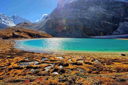 牛奶海是神山中的綠寶石,清瑩的牛奶海簇擁在群山之中,湖水的顏色由黑到碧綠再到藍色,遠遠望去仿佛鑲嵌在群山中的綠寶石。