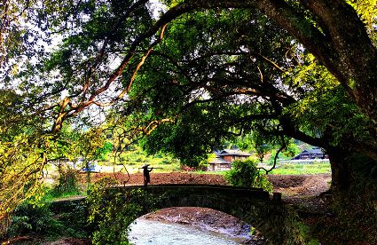 水口小橋流水,古樹蓊郁。村子打開山門,山風整裝待發(fā),夏天不遠了。茂盛的地脈樹下,都能看到傘的影子。