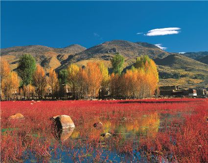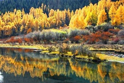環(huán)抱高原海子的水草也由養(yǎng)眼的綠色向迷人的金色變化。各色的高原海子倒映著青黃相間的白樺林、皚皚雪山、藏族村寨,讓人感到祥和而寧靜。