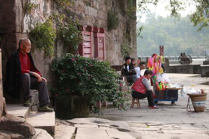 大榮橋。這座建在瀨溪河上、歷經(jīng)數(shù)百年的古石橋,一頭連著大足的地盤,一頭連著榮昌的地盤,故名??创髽s橋的最佳觀景點(diǎn)設(shè)在大榮寨對(duì)面的萬靈山腰,從那里看大榮橋和橋拱那端毗鄰的大榮寨,一種看白描連環(huán)畫中古鎮(zhèn)的感覺,就冉冉升起了。