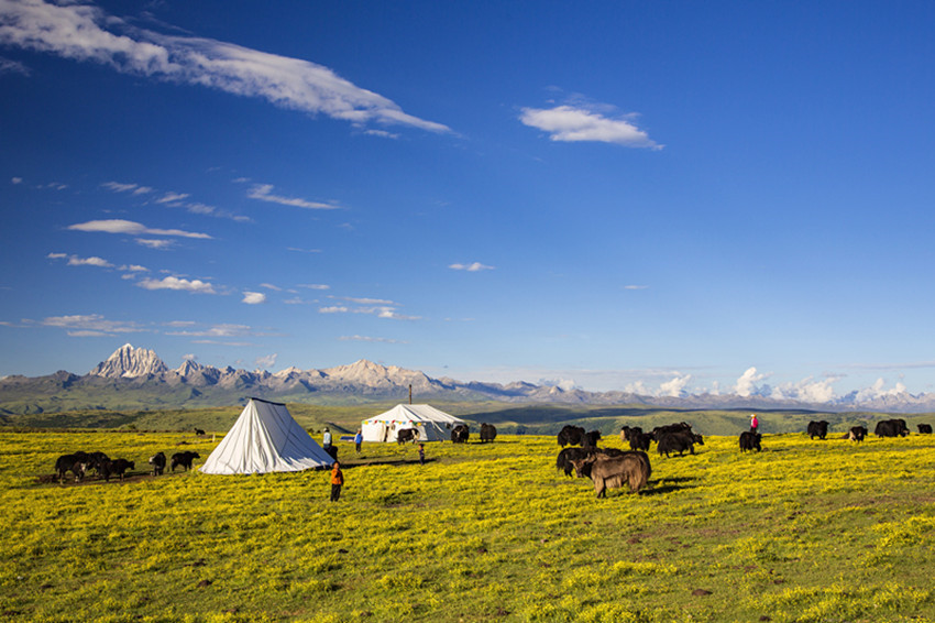 然后行走在山水之間,擁抱大自然,尋找屬于自己的“詩(shī)和遠(yuǎn)方”。油綠的青稞、小麥,散發(fā)出濃郁的田園風(fēng)味;天邊群山起伏,磅礴的氣勢(shì)瞬間感覺(jué)人在自然面前實(shí)在太渺??;帳篷點(diǎn)綴著開(kāi)滿野花的牧場(chǎng),牦牛哞鳴,一片生機(jī),細(xì)細(xì)體會(huì)牧民“逐水草而居”的生存智慧......