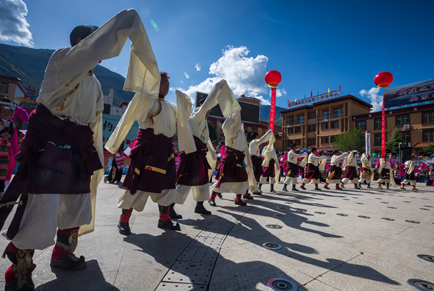 金弦子廣場,舞者們仿若守護(hù)者一般,圍著金黃色的弦子雕塑,或輕歌曼舞或昂揚(yáng)踏步,斑斕的畢旺、搖曳的流蘇和飄逸的紅袖與花共舞,與景相映,聲聲吟唱、步步踏尋,是追憶更是誓言。