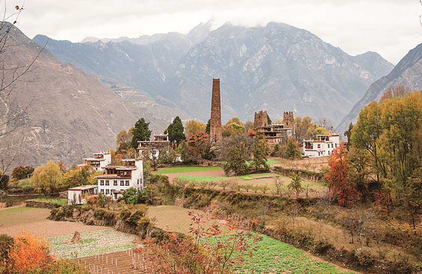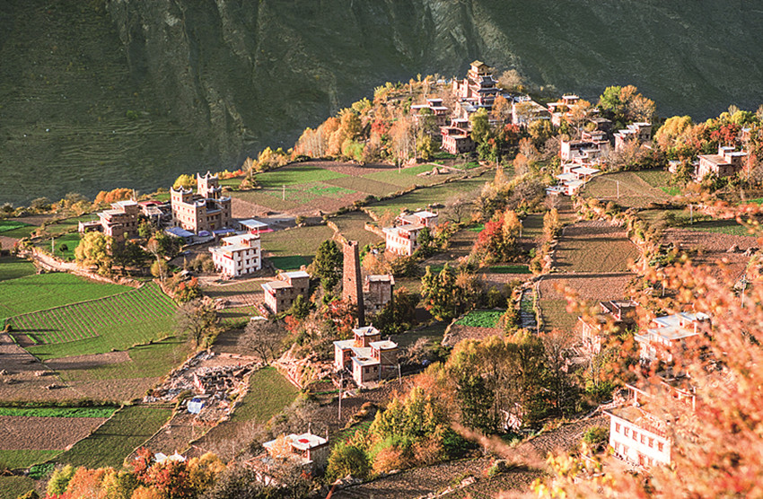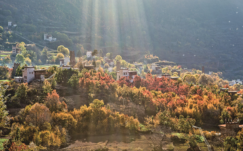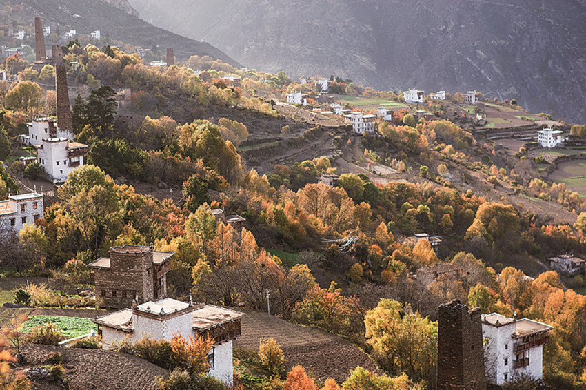 四季更迭,中路藏寨的魅力各異。秋天,正是藏寨最為絢爛的季節(jié)。造型獨特、別致的藏式民居,蜿蜒曲折的林間小道,組成了一幅美不勝收的畫卷。藏寨依山勢迤邐連綿,分布在相對高差近千米的山坡上,藏式樓房灑落在五彩斑斕的彩林中,與山谷、溪流、雪峰交相輝映,極富層次,構(gòu)成了一幅恬靜如詩的優(yōu)美畫卷。