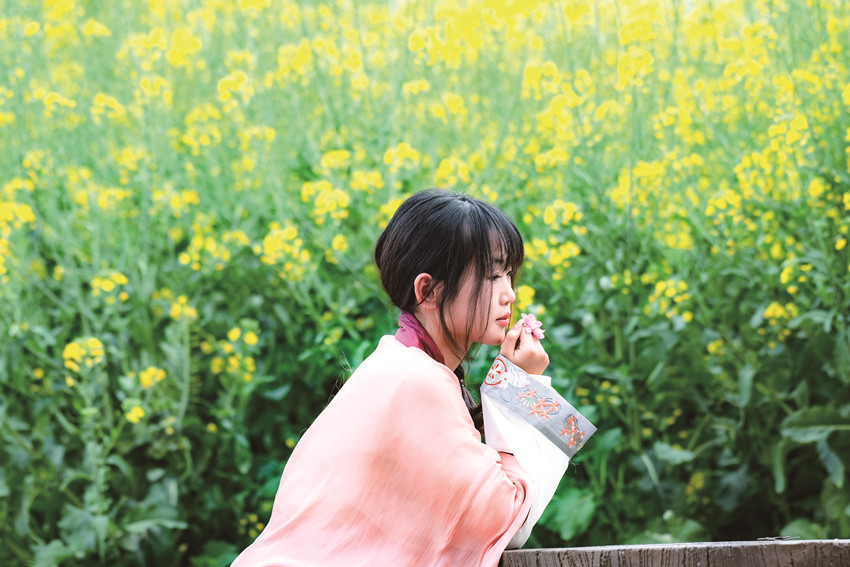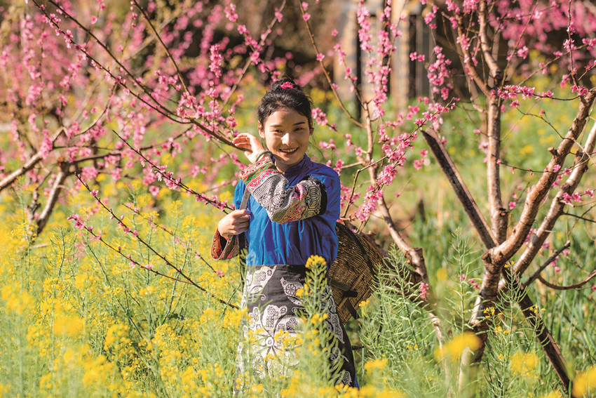 陽春三月,驅(qū)車百里,峰回路轉(zhuǎn),至一小鎮(zhèn),喚烏拉溪,為古驛站。背夫崖下,峻山環(huán)護,小河繞村,屋舍散落,白墻灰瓦,綴以紅檐,桃花夭夭,棧道蜿蜒??图倚∨?,青衣嬌容,穿行花間,簪花比俏。昔日荒坡,綠樹成蔭,繁花之下,草莓豆莢,青果胡豆,蔓草芳苓。