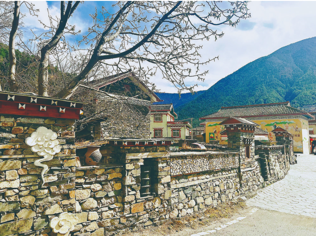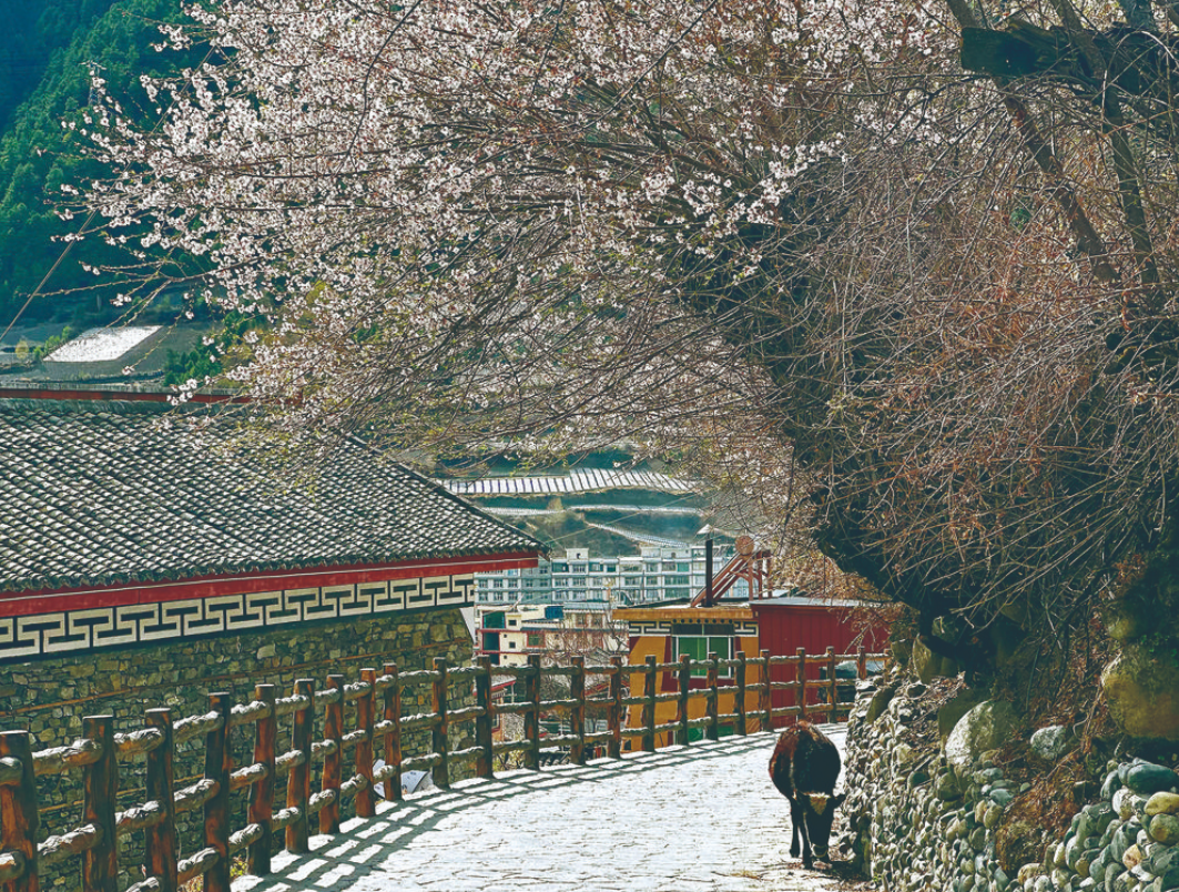 進(jìn)入寨子大門,看到路兩旁、地坎上和藏房四圍有粉白的山桃花盛開。顧不得放下背包,便走向干凈整齊的村道,有三三兩兩的老人坐在院門外吃清茶、吸葉子煙。幾頭黃牛甩著尾巴從一塊草坪上走來,四蹄子有節(jié)奏的跺打著瀝青路面,聽到水聲,它們一齊把頭埋在了路旁的一條沿溝邊啜飲清水,嘴角發(fā)出了吱吱的暢飲聲。