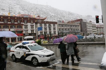 當天,記者來到康定城區(qū),一路上看到,從新城下來的車輛,有的車頂上都頂上了20公分左右的“雪帽”了。
