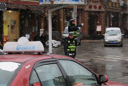 在將軍橋,為方便車輛順利通行,三名交警們一大早就上崗了。雖然雪仍然下著,但交警站在指揮臺上,認真指揮著過往車輛。