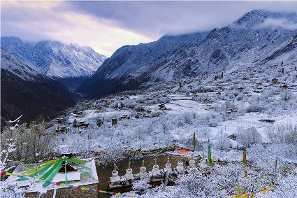 突然,耳畔傳來了誦經(jīng)聲。山坡下的平臺上,是一排白塔。白塔的周圍,掛滿了經(jīng)幡。早起的誦經(jīng)人,沿著中路藏寨的小路來到白塔,一邊轉白塔,一邊虔誠誦經(jīng)。一年四季的地區(qū)稱春雨貴如油,那么旱雨兩季的地區(qū)該怎么贊美春雪呢?怕是該稱為春雪貴如金了。祈愿吧——一年好時節(jié),又是一個豐收年!