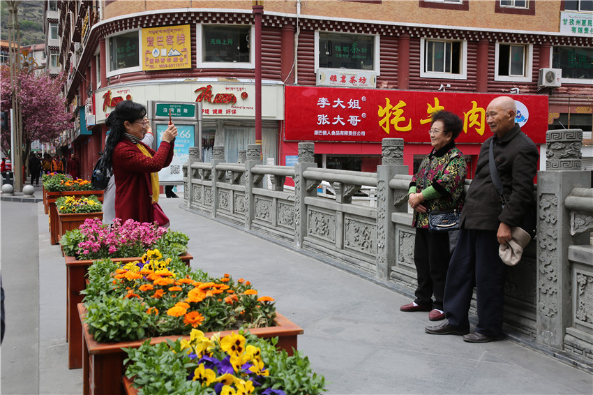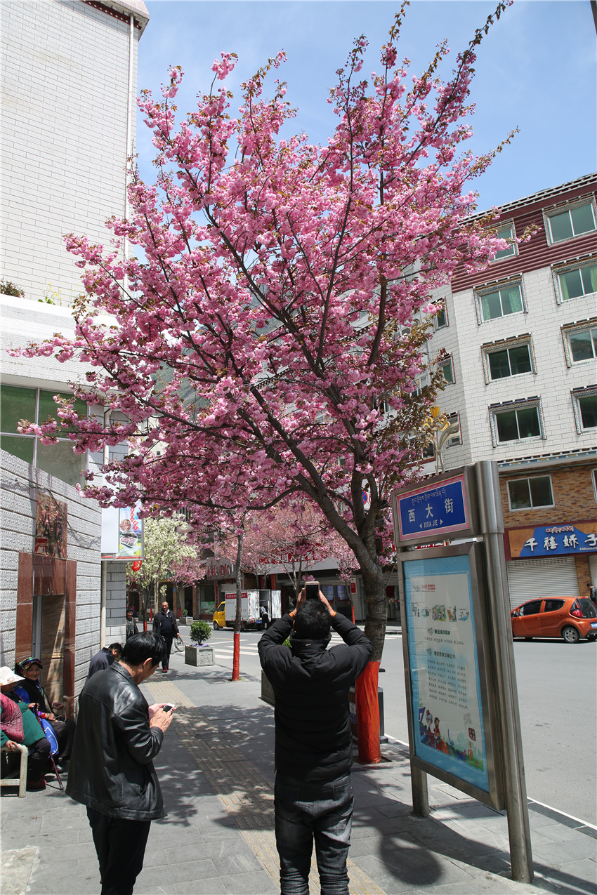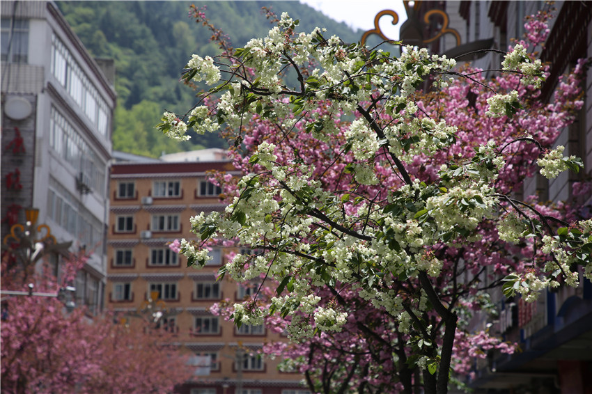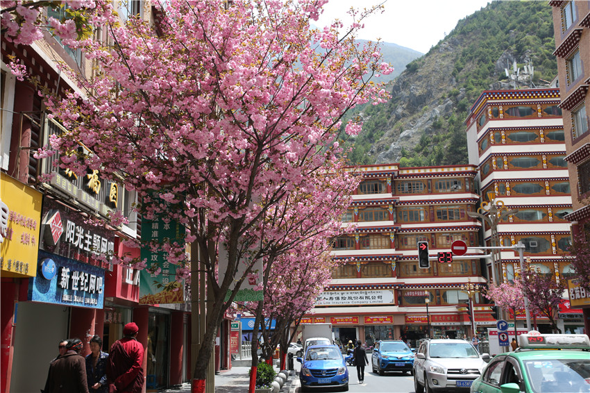 當(dāng)春天遇見最美的櫻花時(shí),驚艷了整個(gè)康定。櫻花與身邊人都將成為春日里的浪漫風(fēng)景。櫻花之美,美在氣勢,櫻花紛飛,夢幻唯美。每年4月中旬,康定城北門的櫻花綻放后,人們像是約好了一樣聚集到這里,共赴這一場甜美盛宴。這一路繁花似錦,人們穿過枝椏花正盛的櫻花林,穿過粉色海洋,徑直奔向一個(gè)浪漫的童話,一路櫻花飄散,一路粉光燦爛。櫻花絢麗繽紛、陸續(xù)綻放,若恰逢一陣春風(fēng)經(jīng)過,櫻花瓣隨風(fēng)舞動(dòng),猶如紛落的雪花,空氣中浮動(dòng)著櫻花特有的淡淡香氣,令人不禁懷疑自己置身夢境?!翱刀ǖ拇禾靵淼靡硪恍?,綻放的櫻花,滿街的花草,折多河畔楊柳依依,康定的春天無比驚艷,醉了游人?!敝芟壬贿吪恼?,一邊感嘆,他在康定生活了40多年,20年前的康定,可以說找不到像樣的花草樹木,進(jìn)入新時(shí)代,康定城市變美了,城市綠化走在了前面,城市的美譽(yù)度舒適度不斷提升??刀ㄖ?,春色滿園,姹紫嫣紅,風(fēng)光旖旎。