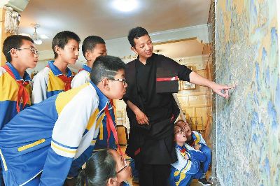 著著是當(dāng)?shù)匦∮忻麣獾漠嫀?,?4歲從臨摹、勾線定型、著色染色開始學(xué)起,3年后就出師獨(dú)立作畫。17年時間,他繪制了3000多平方米的壁畫和數(shù)百幅唐卡,光筆就畫禿了20000多支。去年,著著憑借《南絲路一帶緣藏漢人一家親》成為當(dāng)年文藝界最高獎山花獎的獲得者。今年,他圍繞“一帶一路、藏漢和睦”為主題而創(chuàng)作的大幅唐卡畫作也即將收尾。