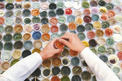 傳統(tǒng)的唐卡是藏族文化中一種獨(dú)具特色的繪畫藝術(shù)形式,需經(jīng)繃布、打磨、定位、起稿、涂色、暈染、拉線條、拉金線等多種程序,天然原料作色保證了畫作幾百年后色澤還依然鮮艷。在著著的畫室里,擺放了百個裝滿各色礦物質(zhì)顏料的調(diào)色小碗,“上色用的是延續(xù)千年的礦物研磨顏料。”為了讓顏料作色更均勻,著著還用自己的辦法搞出了專用的顏料攪拌機(jī)。