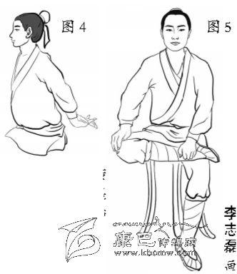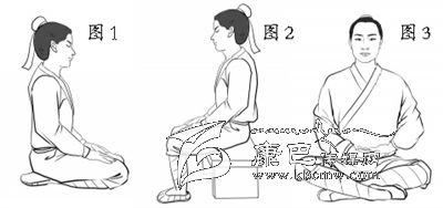 平坐。漢代以前,古人大多采用平坐,即以膝居地,小腿平置于地,臀部貼于腳后跟,就像跪坐一樣(圖1)。不管是在地板上,還是在床上,都采用這種坐法。平坐又叫正坐、安坐等,坐時身體挺直,眼睛平視,是最體面、權(quán)威的坐法。