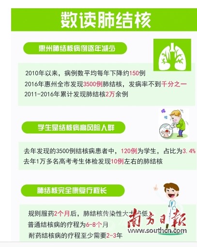 惠州市第一人民醫(yī)院健康管理中心主任彭可同樣為這一論斷提供了數(shù)據(jù)支撐。該院長(zhǎng)期以來(lái)負(fù)責(zé)惠州市直高中的高考體檢工作,據(jù)彭可透露,肺結(jié)核是高三學(xué)生在體檢中檢出異常最多的病癥,2016年共有1萬(wàn)多名考生由該院組織體檢,其中發(fā)現(xiàn)10例左右的肺結(jié)核。