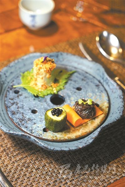 在不少素食店里,廚師會充分利用當(dāng)季食材,不時不食的廣府飲食理念也更為凸顯。慈姑、金桔都是春季的食材,因此被天水蔬食料理運(yùn)用到“雨水”節(jié)氣的菜單里。據(jù)店長介紹,慈姑是生長于水中植物,如同土豆一般軟糯。廚師用南乳和腰果做成堅(jiān)果醬,作為慈姑的配搭醬料。慈姑被切成片,中間夾著梅菜,再用堅(jiān)果醬“粘合”起來,還原慈姑原本的形狀,再通過烤箱烤制,再配搭撒上意大利黑醋的臺山花菜,口感豐富。金桔用來做甜品,將金桔挖空,里頭放入一個核桃,表面再鋪上一層風(fēng)干的金桔果干,做成一件小巧甜品“金桔核桃糖”,其設(shè)計靈感源自廣東金桔糖。與它一同出場的還有用金桔果肉打醬做成的金桔年糕,也十分甜美。