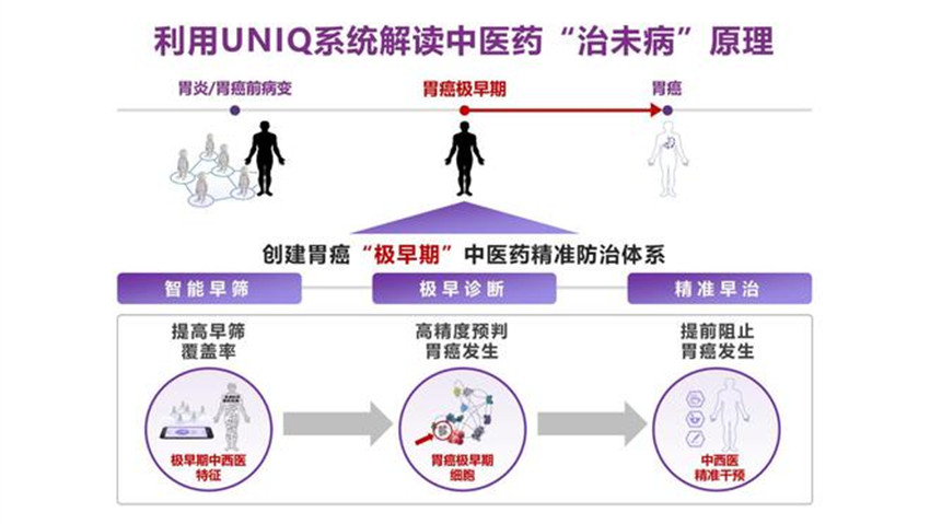 利用UNIQ系統(tǒng),結合大規(guī)模臨床病例的采集和檢測,李梢?guī)ьI團隊發(fā)現(xiàn)了胃癌“極早期”這一全新的階段,中醫(yī)上主要表現(xiàn)為本虛標實、寒熱失衡。從中醫(yī)典型病例中還發(fā)現(xiàn)寒、熱舌苔菌群等新型標志物,尤其是首次構建了胃炎癌轉化的單細胞網絡,發(fā)現(xiàn)了與胃早癌細胞高度接近的胃癌極早期細胞。經2700余例胃炎癌轉化序貫病例樣本驗證,發(fā)現(xiàn)該標志物能夠使得胃癌發(fā)生的預判提前10個月,準確率達85%。探測出的胃癌極早期細胞如果處于萌芽期,進行中藥干預就可能延緩甚至阻斷其癌變,有望為解決我國胃癌早診率低的難題提供突破口。