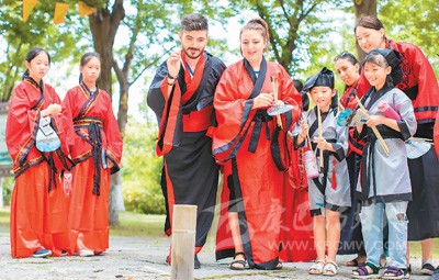 浙江省長(zhǎng)興縣陳武帝故宮內(nèi),外國(guó)游客和學(xué)生們一起體驗(yàn)投壺游戲。