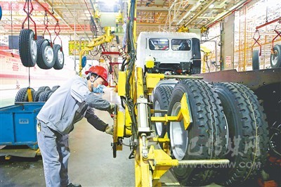 自復工以來,安徽馬鞍山市經(jīng)開區(qū)內(nèi)的華菱星馬汽車集團一手抓疫情防控,一手抓生產(chǎn)和市場,各項工作順利推進,產(chǎn)能完全恢復到疫情發(fā)生前水平。圖為工人正在安裝輪胎。