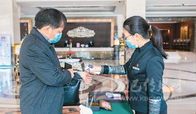 工作人員在內蒙古自治區(qū)呼和浩特市一家飯店為進店就餐的顧客測量體溫。