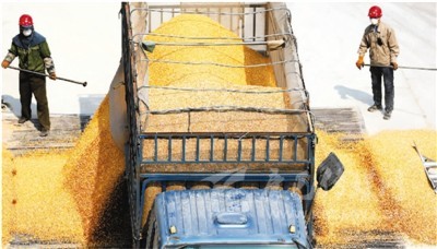 4月13日,在遼寧省鞍山市臺安縣新開河糧食儲備庫,兩名工作人員卸載剛剛收儲的玉米。