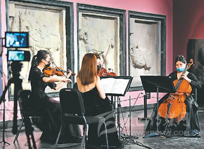 在西安碑林博物館昭陵六駿石刻前,西安交響樂團(tuán)“弦上莫奈四重奏”為“云上國寶”音樂會彩排。