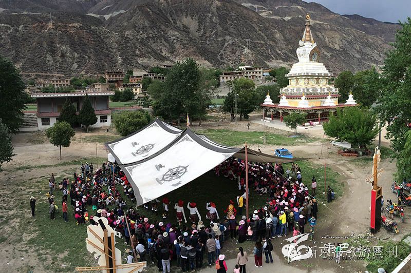觀看藏戲表演的群眾和僧侶。