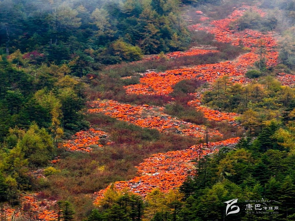 路段兩邊就是貢嘎雪峰所在的大雪山,貢嘎雪峰是整個橫斷山區(qū),也是青藏高原東部最高的山峰,海拔高達7556米。圍繞著貢嘎雪峰有許多海拔五六千米的雪峰,這條路就要從這些雪峰中的一處低矮處通過。我看到一條條冰川從雪峰下流淌下來,冰川流動的速度太快,還來不及融化,就沖進了郁郁蔥蔥的森林,冰川末端融水形成的河流蜿蜒地流淌在針葉林中。河谷很寬闊,這是洪水和泥石流暴發(fā)時沖出來的。然而奇怪的是本來應(yīng)該是灰白色的卵石鋪就的河谷,現(xiàn)在卻是鮮紅的顏色。紅色的河谷從雪山一直鋪陳下來,好像是一個油漆匠把他的油漆桶弄翻了,紅色的油漆流淌出來,又好像行為藝術(shù)家的大制作。
