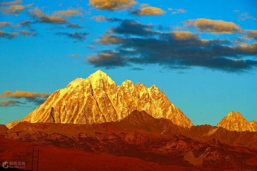 貢嘎山位于康定城南約55千米處,“貢嘎”為藏語(yǔ)“雪白”之意。貢嘎山險(xiǎn)峻挺拔,峰項(xiàng)有70平方米的平臺(tái),終年積雪覆蓋,晴空萬(wàn)里時(shí),閃耀著熠熠光芒,瑰麗壯觀。