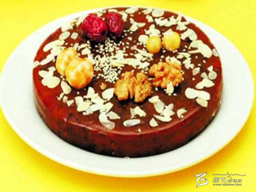八寶年糕 原料 糯米1000克,白糖、麻仁青梅、葡萄干、瓜條、白蓮、桃脯、豬油各20克。 做法 先將糯米淘洗干凈,水浸24小時(shí)后上蒸籠蒸爛,取出用木棒搗爛攤涼,把白糖等搓勻成餡,在方盤(pán)內(nèi)刷豬油,鋪上搗爛的1厘米厚的糯米飯,每鋪一層放入適量的餡,共鋪3層,蒸熟后用刀切為小塊即成。 夾心年糕 原料 糯米1000克,青紅絲、小豆、白糖各50克。 做法 將糯米洗凈浸泡24小時(shí)后上蒸籠蒸爛,取出用木棒搗爛后展切成2塊,把小豆煮爛加糖再加青紅絲做成餡撒于其中一塊上,再將另一塊放在餡上壓實(shí)壓緊,用刀切成塊即可。
