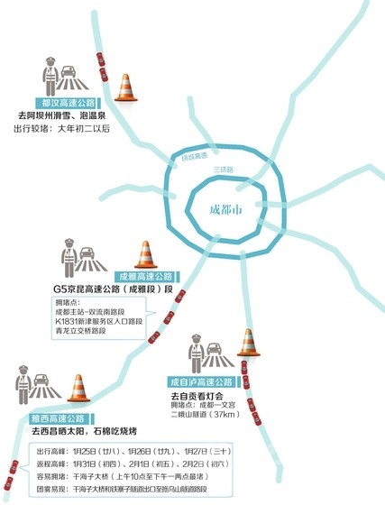 回成都如遇擁堵,交警建議,從瀘州、自貢出發(fā)回成都的車輛,可在成自瀘高速寶飛或仁壽站下高速,經(jīng)老成仁路返回成都;自貢、內(nèi)江的車輛不一定非要來擠成自瀘,可選擇樂自、宜瀘、樂宜高速返回成都。如果成都站出站車流量大,可選擇大林站、興隆站,從老成仁路、雙流錦繡東山快速通道到成都。