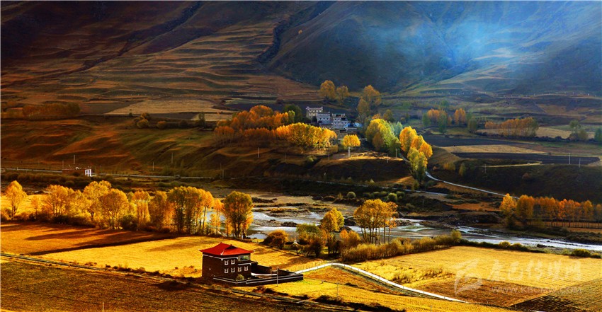 沿著公路行駛,您會看到公路兩邊的青稞都已金燦燦,綠葉變黃,溪水靜靜流淌,小樓上的經(jīng)幡隨風(fēng)舞動(dòng),白塔依稀林立,陽光照耀下的東路各縣市的空氣中充收獲的氣息。 藍(lán)天白云,小橋流水,金黃色的白楊樹,精美的藏式小樓,在光與影的映射下,仿若一幅油畫,等待您的發(fā)現(xiàn)和欣賞。