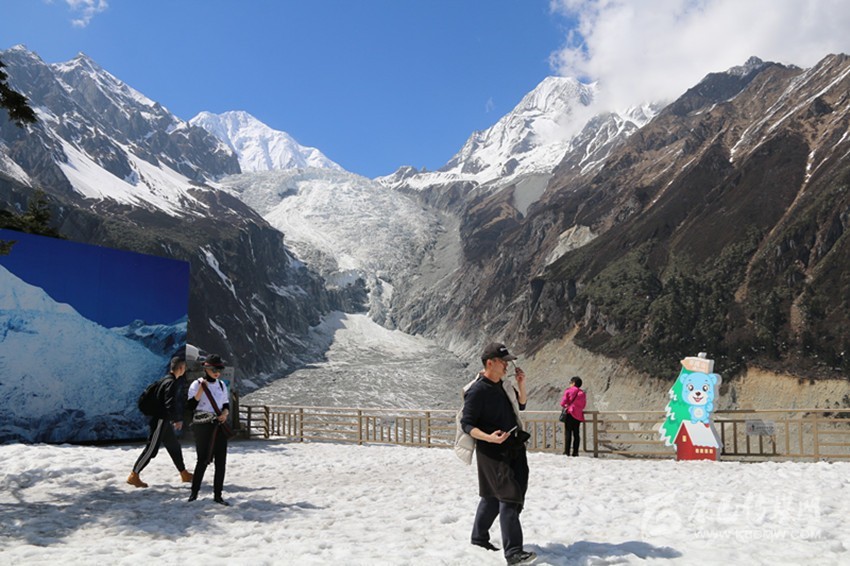 貢嘎雪山白雪皚皚,祥云環(huán)繞,大冰瀑布潔白如玉。連日來的晴好天氣,使得圣潔的海螺溝冰川一覽無余,美得令人窒息。3月26日,來自成都市郫都區(qū)的王先生在冰川觀景臺摘下口罩,貪婪地呼吸著新鮮空氣,舉著相機(jī)狂拍不停?!拔襾磉^海螺溝幾次,因為天氣原因,難得一見冰川的‘真容’,今天天氣好,雪峰潔白耀眼,像亭亭玉立的少女,能夠一睹海螺溝冰川風(fēng)采,真是很幸運(yùn)?!笔?疫情影響,王先生已經(jīng)宅家兩個月了,“感覺像關(guān)在籠子里一樣,心情壓抑”。目前,他工作的汽車廠還沒有復(fù)工,便迫不及待地自駕獨(dú)自西行來到海螺溝。