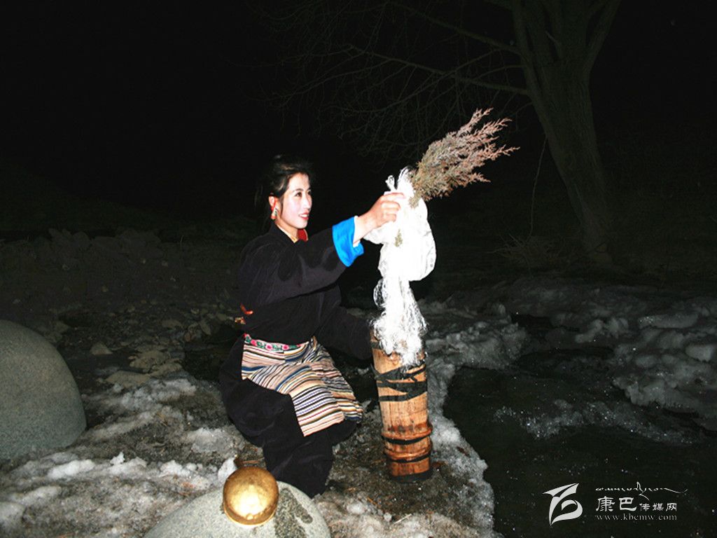 在除夕這天,家里的婦女會把庭院,房屋重新打掃一遍。把垃圾再清理一次。因為習(xí)俗認(rèn)為,初一掃地和除垃圾會把一年的財運和好運都掃走。這天,大人小孩還要忙著洗頭、洗澡,搞好個人清潔衛(wèi)生。而除夕之夜最重要的一個儀式是“搶頭水”。(新年的第一桶水—晨星水)。傳說,晨星水是人間最吉祥的水。它可以獻神,可以潔身,可以祛病,洗滌一切污垢和不祥,帶來平安和幸福。從除夕夜十二時開始,一個個懷抱柏樹枝和哈達的姑娘或小伙子們披著繁星,爭先恐后地去背晨星水。第一個先到河邊的要熏燃桑煙,并用哈達繞上柏樹枝蘸水向空中拋灑三次,并把柏樹枝放在河邊。背回的晨星水首先要供奉佛祖。然后才可以用來燒茶、洗漱。而家里的五谷斗上則盛滿了糌粑、炒青稞粒、人參果等食品,上插青稞穗,也有在八寶碗里用糌粑和五彩酥油做成“切巴”,供奉在佛堂里。這一切都是為了祈禱來年風(fēng)調(diào)雨順、人畜兩旺、喜獲豐收。除夕夜,在正房桌子上還要擺上各式油炸果子、牛肉坨坨、糖果以及青稞美酒、飲料等等美味佳肴,開始迎接新年的到來。
