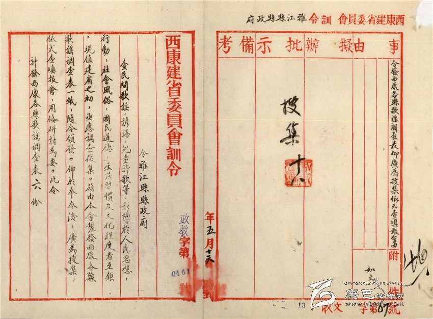 訓(xùn)令題目是“令發(fā)西康各縣歌謠調(diào)查表仰廣為收集依式查填報(bào)會”,由此可知,西康其他各縣也收到了同樣的訓(xùn)令。其內(nèi)容為:查民間歌謠、諺語,兒童詩歌等,影響于人民思想、行動、社會風(fēng)俗、國民道德、生活習(xí)慣及文化程度者至巨?,F(xiàn)值建省之初,急應(yīng)調(diào)查征集,茲由本會制發(fā)西康各縣歌謠調(diào)查表一紙,隨令頒發(fā)。仰于奉令后,廣為收集,依式填報(bào)會,備研討為要。此令,計(jì)發(fā)西康各縣歌謠調(diào)查表6份。署名是“西康建省委員會”。