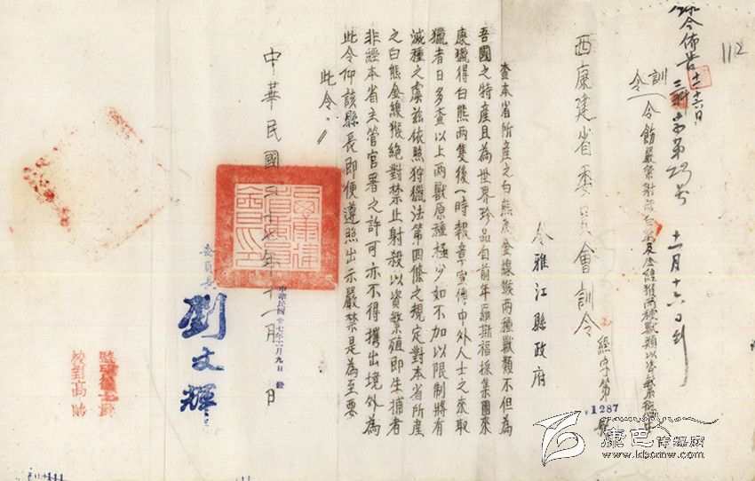 民國27年(公元1938年),“西康省建省委員會”發(fā)出“經(jīng)字第1287號”訓(xùn)令,這是一份難能可貴的保護野生動物的訓(xùn)令,訓(xùn)令說:“查本省所產(chǎn)之白熊及金線猴兩種獸類,不但為吾國之特產(chǎn),且為世界珍品。自前年羅斯福采集團來康獵得白熊兩只后,一時報章宣傳,中外人士之來取獵者日多。查以上兩獸原種極少,如不加以限制,將有滅種之虞。茲依照狩獵法第四條之規(guī)定,對本省所產(chǎn)之白熊、金線猴絕對禁止射殺,以資繁殖。即生捕者非經(jīng)本省主管官署之許可,不得帶出境外。為此令仰該縣長即便遵照出示嚴(yán)禁是為至要,此令。”訓(xùn)令最后署有“西康建省委員會委員長劉文輝”的簽名。