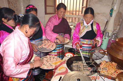 巴塘人一年當(dāng)中有很多重要的節(jié)日,而最重要的莫過(guò)于過(guò)春節(jié)。隨著農(nóng)歷新年的來(lái)臨,巴塘人過(guò)春節(jié)的氛圍也越來(lái)越濃烈了。掃塵、貼春聯(lián)、殺年豬、罐血腸、樹(shù)經(jīng)幡、獻(xiàn)“切瑪” 、曬牛肉干、做長(zhǎng)面、炸“花茹” 、 釀青稞酒等等,人們臉上綻放出春天的笑顏,喜逐顏開(kāi)迎候新春佳節(jié)的到來(lái)。而在眾多的風(fēng)味飲食中,炸“花茹” 、 吃長(zhǎng)面(當(dāng)?shù)厝朔Q之為“金絲面”)是巴塘人春節(jié)時(shí)家筵中必不可缺的美食佳肴。