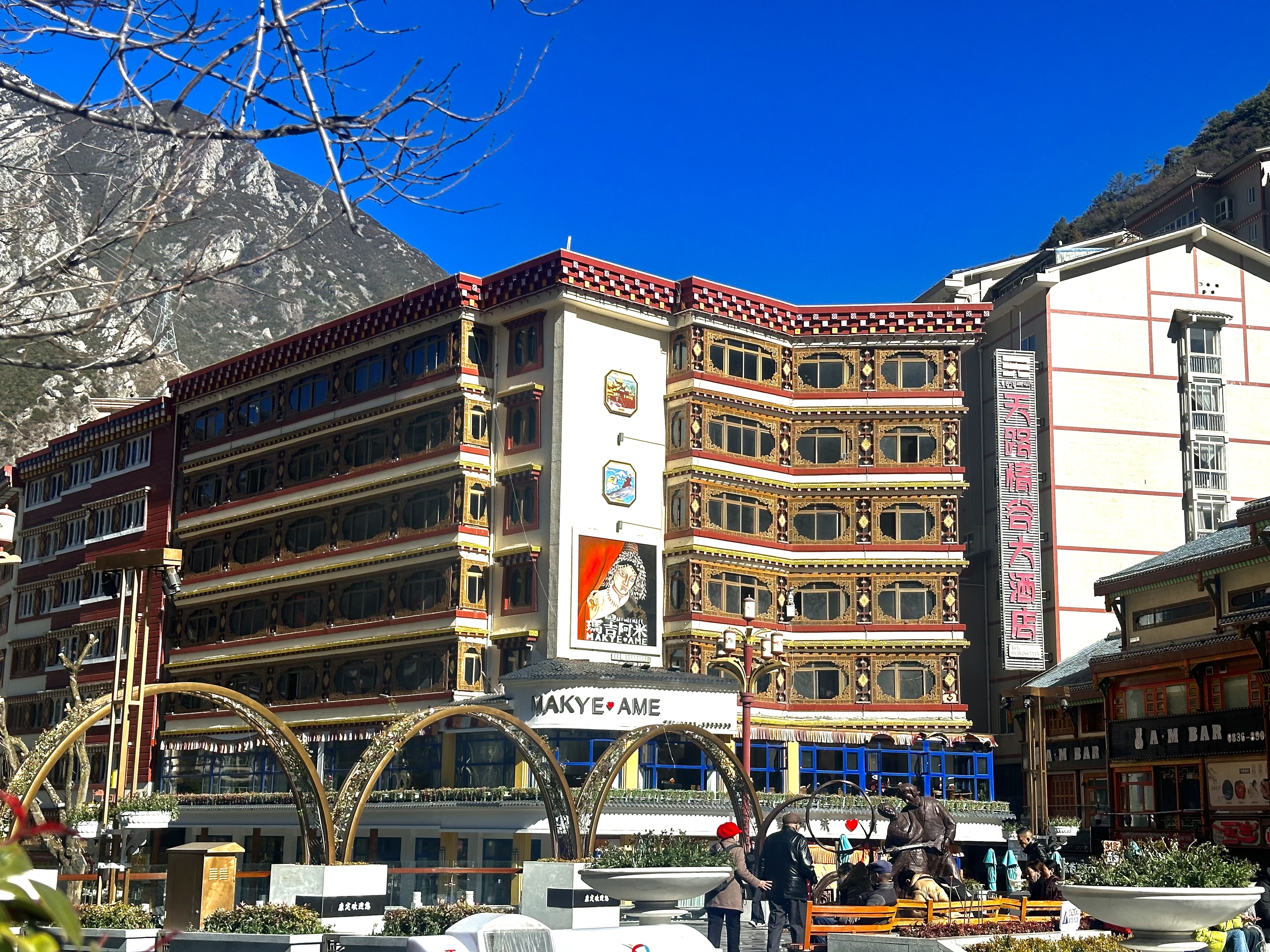 每天出門采訪,我都會聽著穿城而過的河水聲經(jīng)過幾座大橋。距離報社最近的橋叫將軍橋,岸邊酒樓茶肆相依,橋邊顯耀地矗立著一座清代名將岳鐘琪倚馬攬卷的雕像。他曾參與平定川西戰(zhàn)事,??刀ò矊帲?shù)厝烁心钏墓?,修造了這座以“將軍”命名的橋。逆流而上,是一座色彩斑斕的石拱橋,橋頭刻有“公主橋”幾個大字。據(jù)說,這座橋是為紀念文成公主與松贊干布聯(lián)姻而興建。公主橋頭,有民間畫師繪制的大幅壁畫,講述著文成公主進藏的那段悠遠歷史。天晴的時候,總有人在壁畫下的臺階上坐成一排曬太陽。風起,壁畫中的公主和侍女們衣袂飄飄,仿佛走出了遙遠的時光,和今人并行。還有郭達山下的郭達橋,橋中間塑造著郭達將軍彎弓射箭的雕像。對于郭達橋名字的由來,有幾種傳說,但多歸結于諸葛亮南征時,曾命部將郭達將軍在此山上架爐造箭,所以把山邊折多河上的橋也取名郭達橋。旅游旺季時,從各處趕來的藝人悠閑地在橋上彈唱扎年琴、吹薩克斯、彈奏巴揚琴。他們沉醉在演奏中,駐足的、過往的人皆是合奏中的風景。