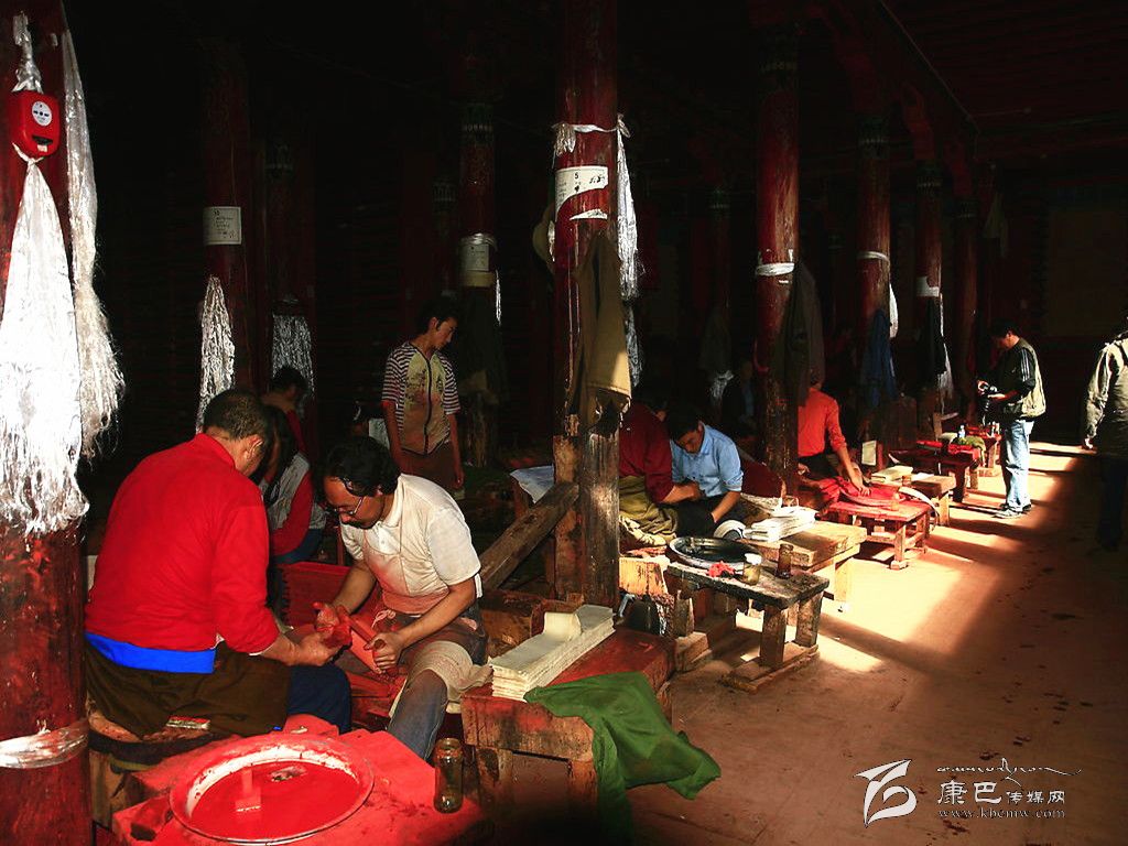 德格印經(jīng)院的各種傳統(tǒng)產(chǎn)業(yè),當(dāng)?shù)鼐用竦纳a(chǎn)勞動(dòng)都立足于當(dāng)?shù)刈匀画h(huán)境資源,并且全面地支持著傳統(tǒng)印刷技術(shù)系統(tǒng)的各階段。包括“瑞香狼毒”的草根造紙方法,均與德格地區(qū)的傳統(tǒng)產(chǎn)業(yè)有關(guān)。藏紙是當(dāng)?shù)鼐用裼脗鹘y(tǒng)手工方式制造的印刷紙,是用一種叫“阿交如交”(瑞香狼毒)草本植物根須為原料制造而成。這種紙的顏色微黃,質(zhì)地較粗厚,但纖維柔軟,不易脆,吸水性強(qiáng),同時(shí)還具有防蟲蛀、防鼠咬,久藏不壞的特點(diǎn)。印經(jīng)院的印刷用色通常分為紅版和墨版兩種。木刻印版的刻制工作更為艱辛,印經(jīng)院選聘藏文知識(shí)高深淵博的名士將所要刻制的圖書進(jìn)行嚴(yán)格細(xì)致的三級(jí)審校,才可由聘請(qǐng)的藏文書法技藝精深的學(xué)者嚴(yán)格按照藏文書法正楷要求開始橫版書寫工作,他們將圖文描繪在半透明的薄紙上反貼在板面上??坦円罁?jù)紙上的色差進(jìn)行刻制,刻完后編師們?cè)谇鍢由线€要進(jìn)行三校,版面改動(dòng)較多的必須進(jìn)行重刻,一般的進(jìn)行補(bǔ)刻。直至完全準(zhǔn)確無(wú)誤時(shí)將印版放在酥油里浸泡一天后,取出曬干,再用一種名叫“蘇巴”的植物根熬水洗凈曬干,至此一塊印版的制作才算全部完成,可入庫(kù)上架和進(jìn)行印刷。通常情況下,技藝嫻熟的一名工人每天完成一張書版的單面刻制,畫版刻制工作量更大。雕刻技工都是來(lái)自本地及周邊地區(qū)的民間藝人。