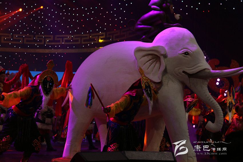 此次藏歷新年春晚被命名為“圣潔家園”,為了應(yīng)“家園”這個(gè)景,導(dǎo)演組頗有“心機(jī)”的將藏元素“和睦四瑞”搬上了舞臺(tái),在開場(chǎng)舞中,兩個(gè)用石膏打造的、栩栩如生的“和睦四瑞”被演員緩緩?fù)粕衔枧_(tái),贏得觀眾陣陣歡呼。在民間傳說中大象、猴子、白兔、貢布鳥共同發(fā)愿行持善法,貢布鳥鼓勵(lì)同伴們開始持守五戒,并一直堅(jiān)持不懈動(dòng)員其它眾生嚴(yán)守五戒。在它們帶動(dòng)、勸說下,動(dòng)物們都能漸漸做到互不損害、如理如法在木森林中和平度日,以其厲行善法之因,天人也降下和合雨水。后來,整個(gè)大地之上,莊稼豐熟、植物茂密、鮮妍之花滿目盛開,整個(gè)國(guó)家喜獲豐收、財(cái)富圓滿。晚會(huì)也是想利用“和睦四瑞”寓意人民生活團(tuán)結(jié)和睦、和平寧?kù)o的美好愿望。