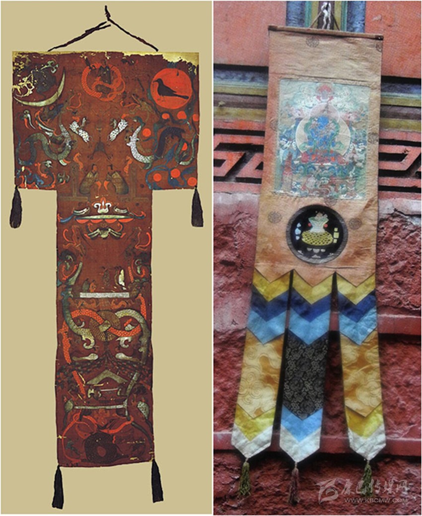 唐卡起源于西藏的另一論據(jù),就是在原始苯教的各種儀式中出現(xiàn)的旗幡畫,旗幡畫可視作為唐卡的前身。