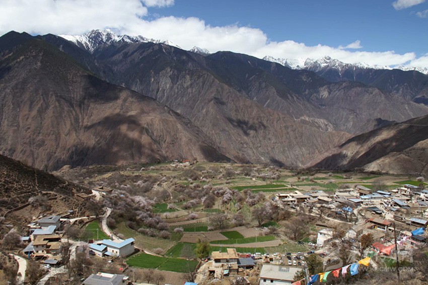 我和張柯在村子里轉(zhuǎn)悠了十多分鐘,也沒(méi)有見(jiàn)到一個(gè)人。我們只好到田野里瞎轉(zhuǎn)。斜達(dá)村的海拔有3305米,在這里可以俯瞰下面山谷對(duì)面的江坡村。因?yàn)楹0胃?,種的都是旱地,地里的青稞才有一尺高。我們從田埂上走過(guò)去,一只碩大的母雞帶著10多只小雞唧唧咕咕的在田地里覓食。我們走到村邊山頭上,放眼望去,對(duì)面的卡瓦格博群山放射著萬(wàn)道金燦燦的霞光,盡顯山之王者的威儀。下面的山谷里,蘭色的炊煙如帳幔般飄拂,好一副山野美景!