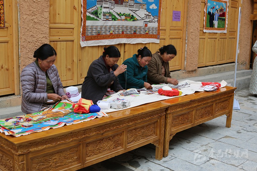 在藏繡展點(diǎn),5名農(nóng)牧民婦女正在合繡一幅藏族建筑刺繡作品?!拔覐?6歲開始跟著父親學(xué)藏繡,傳到我這已經(jīng)是第四代了。除了‘六長壽’、度母像等傳統(tǒng)圖案,今年是新中國成立70周年,我還繡了一幅天安門作品。”47歲的傳承人達(dá)打介紹道。