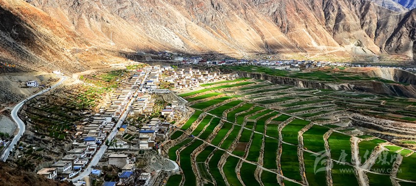 從得榮縣城出發(fā),途經(jīng)日龍鄉(xiāng),汽車順著盤山公路開始往下行駛,到半山腰處,司機(jī)輕輕踩一腳剎車熄火,在此作短暫休息。這時(shí),我打開車門俯瞰金沙江畔的因都?jí)危姽穬蓚?cè)一排排整齊的房屋像火柴盒一樣連綴在平坦壩子上,房屋下端,麥田梯次舒展,麥浪涌動(dòng),蔚為壯觀。
