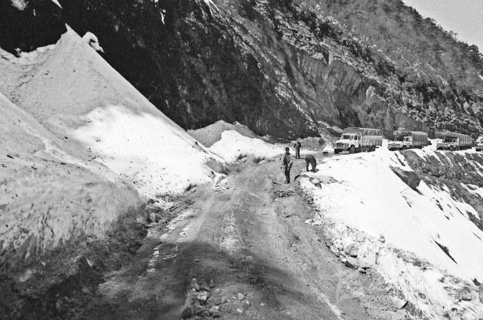 直到上世紀(jì)的七八十年代,人們要翻越二郎山,無(wú)疑還是把腦袋別在褲腰帶上的冒險(xiǎn)之旅,彎急、坡陡、路窄、高反,再加泥濘濕滑,尤其艱難的是上半山那段路,兩道深深的車轍坑槽,車輛只能沿車轍上山,蝸牛般爬行,離開坑槽就意味著死亡,遇上錯(cuò)車誰(shuí)都不愿冒險(xiǎn)出槽,越“雷池”一步。車速要快快不起來(lái),想慢慢不下去,拿駕駛員們的話說(shuō)就是:上山把踩油門的腳蹬進(jìn)了油箱,車子跑不快,下山那怕是剎車踩死,車子還是停不下,堵車成家常便飯,拋錨隨時(shí)會(huì)有發(fā)生。