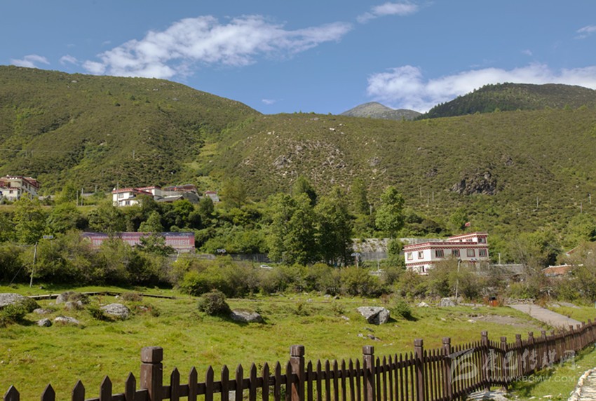折多塘村房舍現(xiàn)多數(shù)沿公路兩側(cè)筑建。其實(shí)沒通公路前,山間馱道應(yīng)是村后呈椅狀的一片草坡上。草坡邊自古就有的一方露天溫泉池塘水霧彌漫,熱氣蒸騰,正應(yīng)了前人所記“山凹有熱泉沸起”、“憇啞池塘,帳宿于折多”;且在舊時(shí)馭馬馱牛的行旅中宿棧,這寬大的草坪方適合繃搭帳蓬和放牧牲畜,露天溫泉又可洗濯行旅之勞頓。