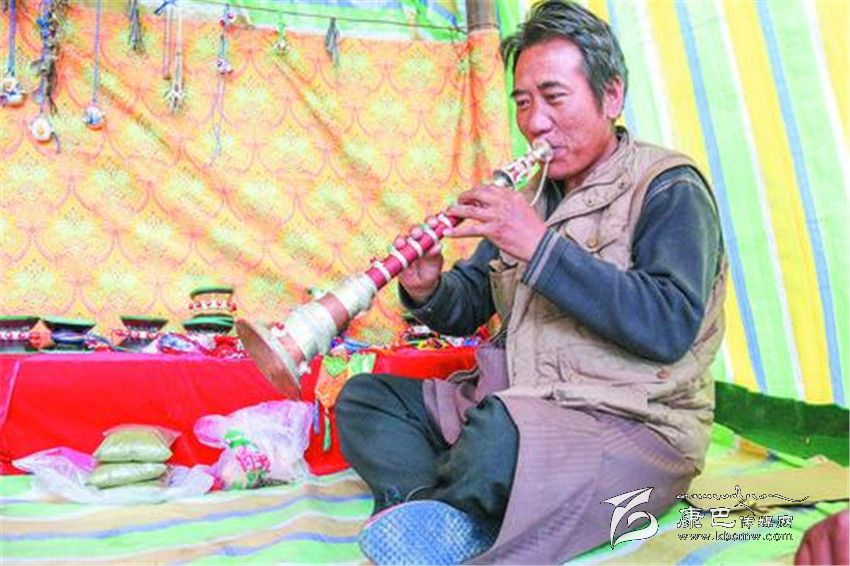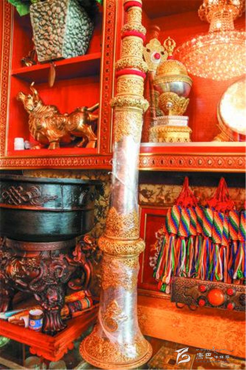 在河坡一代,像根秋丹貞、伍金這樣的手工藝人還有很多很多。其麥一家和根秋丹貞家一樣,也是主要制作佛器,在他的記憶里,爺爺、父親、叔叔、伯伯都是制作藝人,而自己家到底有多長的制作歷史,連他都說不清楚。51歲的扎西次仁這幾天有點忙,聽說噶陀寺最近要舉行法會,而以法器制作為主的他,早早的就在噶陀寺的臨時商點支起了“小賣部”,在這里叫賣自己家的精品法器,嘎烏、計數器、法號等等讓記者看得應接不暇。