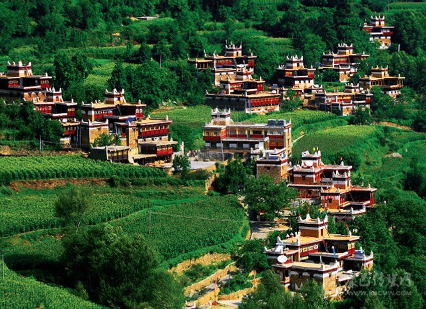 藏式房多平頂,可以說是環(huán)境的產(chǎn)物。高原干旱少雨,無須飛檐高頂,冬有積雪,便于打掃;最重要的是風(fēng)沙大而頻繁,高屋難耐勁風(fēng)。此外,平頂民房還有一個(gè)精神功能就是作為信仰的場(chǎng)所。房頂供奉有神靈的祭壇,有煨桑的香爐,更有家家必插的五色經(jīng)幡,有的房頂平臺(tái)的圖符裝飾極為精美,把最古老的建筑樣式和最現(xiàn)代的建筑格調(diào)融為一體。另一個(gè)共同特點(diǎn)便是,一般講究一些的農(nóng)村都把房子的夯土外壁刷成暗含深意的純白。這自然是典型的藏式院落了。而不太講究的半農(nóng)半牧區(qū)則保持原色。白色房屋上部突出棕色材料的房檐,或漆成棕紅的裝飾帶,既勾勒出輪廓,又平添了幾多美觀。白色建筑在藏語中有個(gè)非常詩意的名字,叫“點(diǎn)點(diǎn)繁星”。
