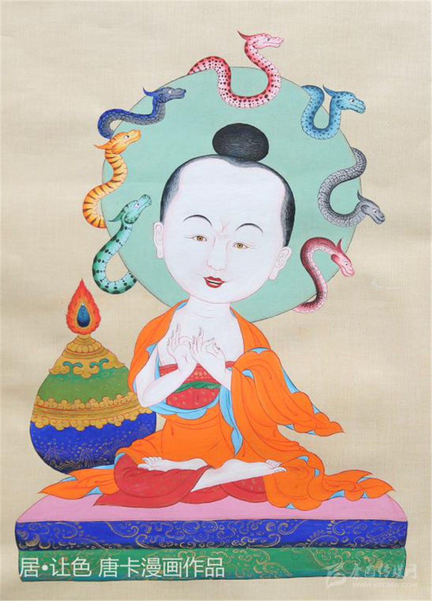 唐卡是藏族最具代表性的藝術門類之一,在其千年的傳承歷史中吸收融合了印度、尼泊爾等多地的藝術元素,發(fā)展成為極具雪域特色和審美價值的藝術形式。傳統(tǒng)唐卡缺乏立體感和形象感,畫面層次模糊,人物形象單薄,不利于民族文化傳承,“對于不懂畫的人來說,這種畫法他們看不懂?!被诖?,居·讓色對唐卡繪畫技法作了改良,結合現(xiàn)代漫畫,以寫實的手法,實現(xiàn)活態(tài)傳承、永續(xù)流傳目的。