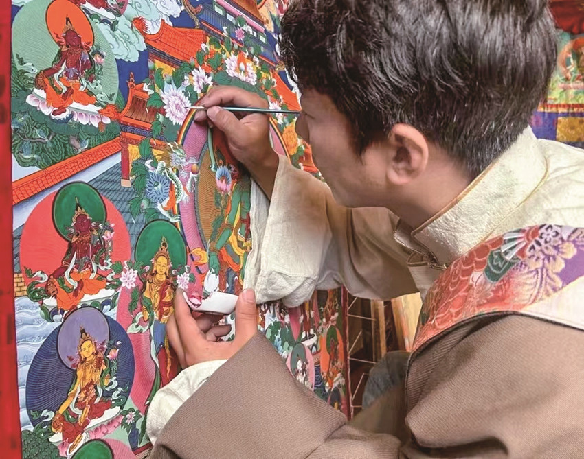 “唐卡作為中國民族繪畫藝術(shù)的珍品,不僅呈現(xiàn)精湛的技藝和美學,更是傳遞一種文化?!睏畹潜硎?,他作為一名縣級非遺傳承人,要在繼承傳統(tǒng)技藝的基礎(chǔ)上,采用多元藝術(shù)技藝賦予傳統(tǒng)唐卡更多創(chuàng)意,讓民族文化瑰寶能夠更好地發(fā)揚光大。
