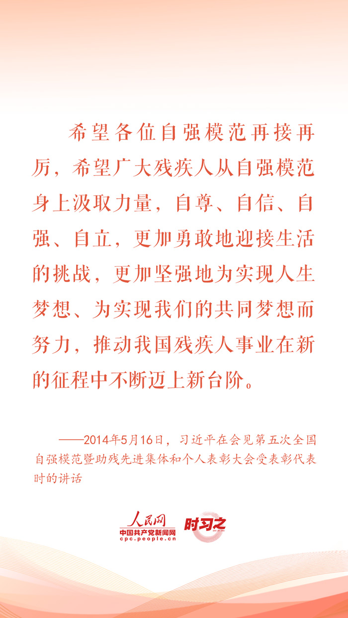 2024年5月19日是第三十四次全國助殘日。對(duì)于殘疾人這個(gè)特殊群體,習(xí)近平總書記始終格外關(guān)心、格外關(guān)注,在不同場合頻頻為他們加油鼓勁,勉勵(lì)他們活出精彩的人生。